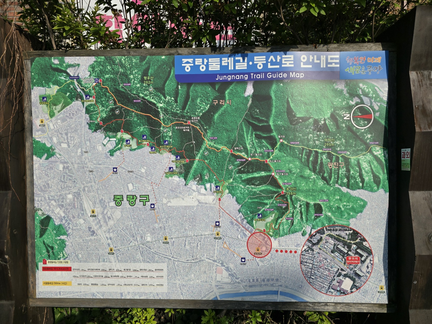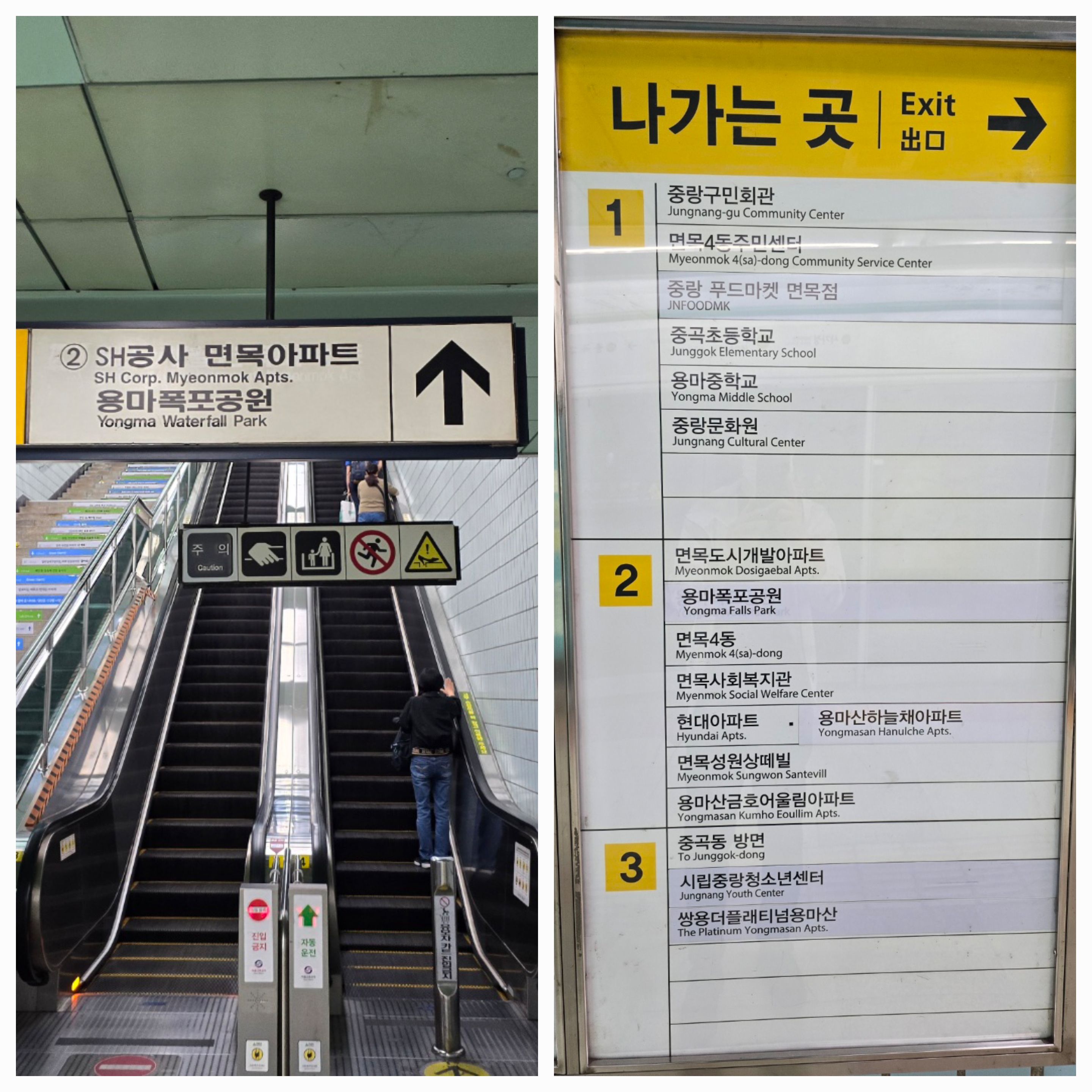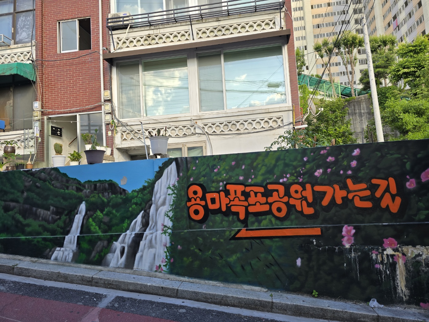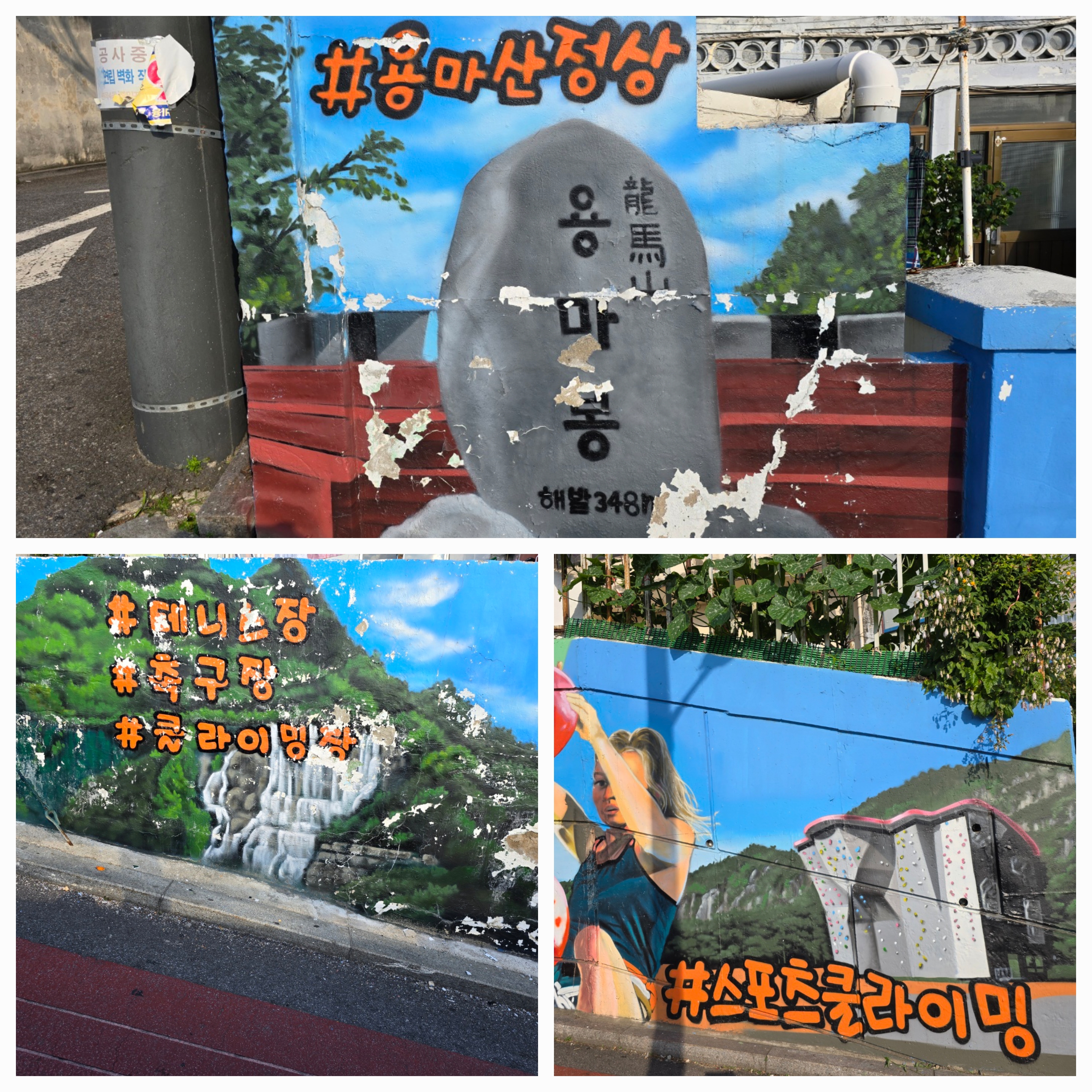 지난번 아차산에서부터 용마산까지의 등산코스를 다녀왔던 터라 이번에는 반대로 가보기로 했다. (잘한 선택이었음 👍) 용마산역 2번 출구로 나오면 중랑둘레길, 등산로 표지판도 나오고 우측에 보이는 계단을 이용하면 용마폭포공원으로 이어져 바로 용마산 등산코스로도 진입할 수 있다. 용마폭포공원 가는 길과 용마봉, 용마폭포, 스포츠클라이밍이 담벼락 벽화에 그림으로도 그려져 있었다. 이런 벽화를 볼 때면 동네를 상징하고 있는 것들을 표현하고 있어 더 오래 기억에 남을듯하다.