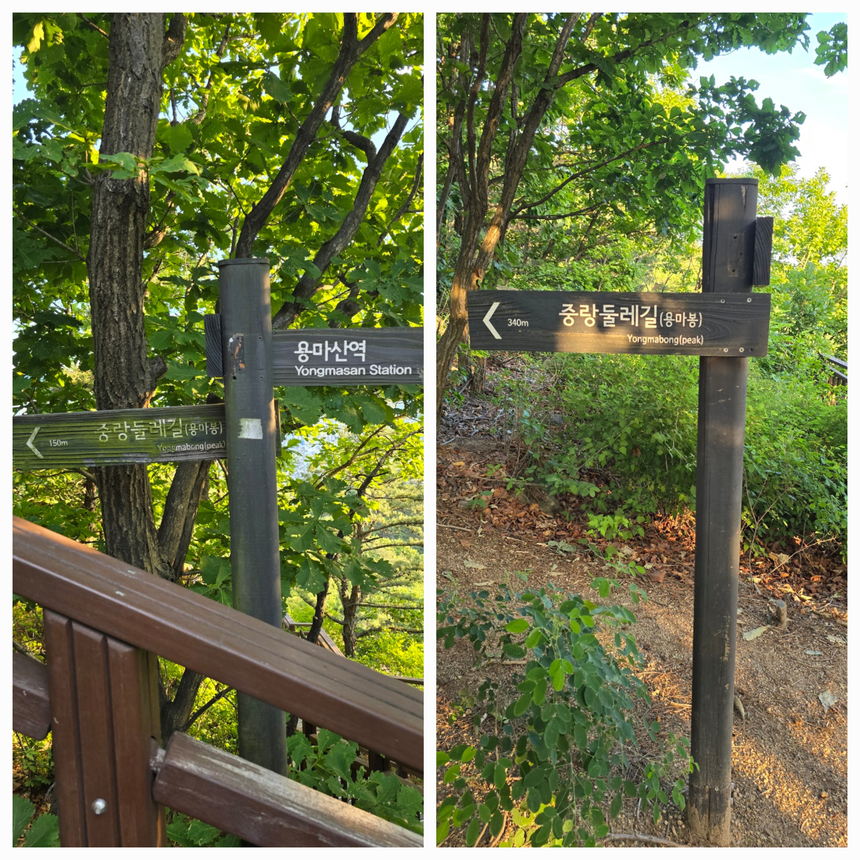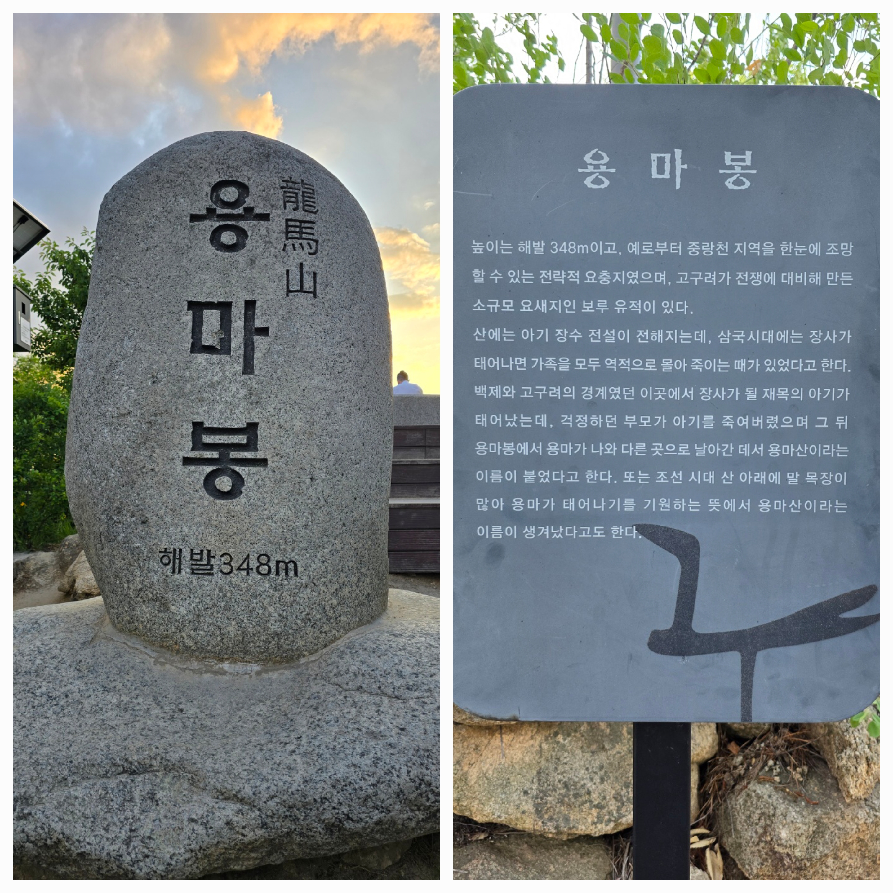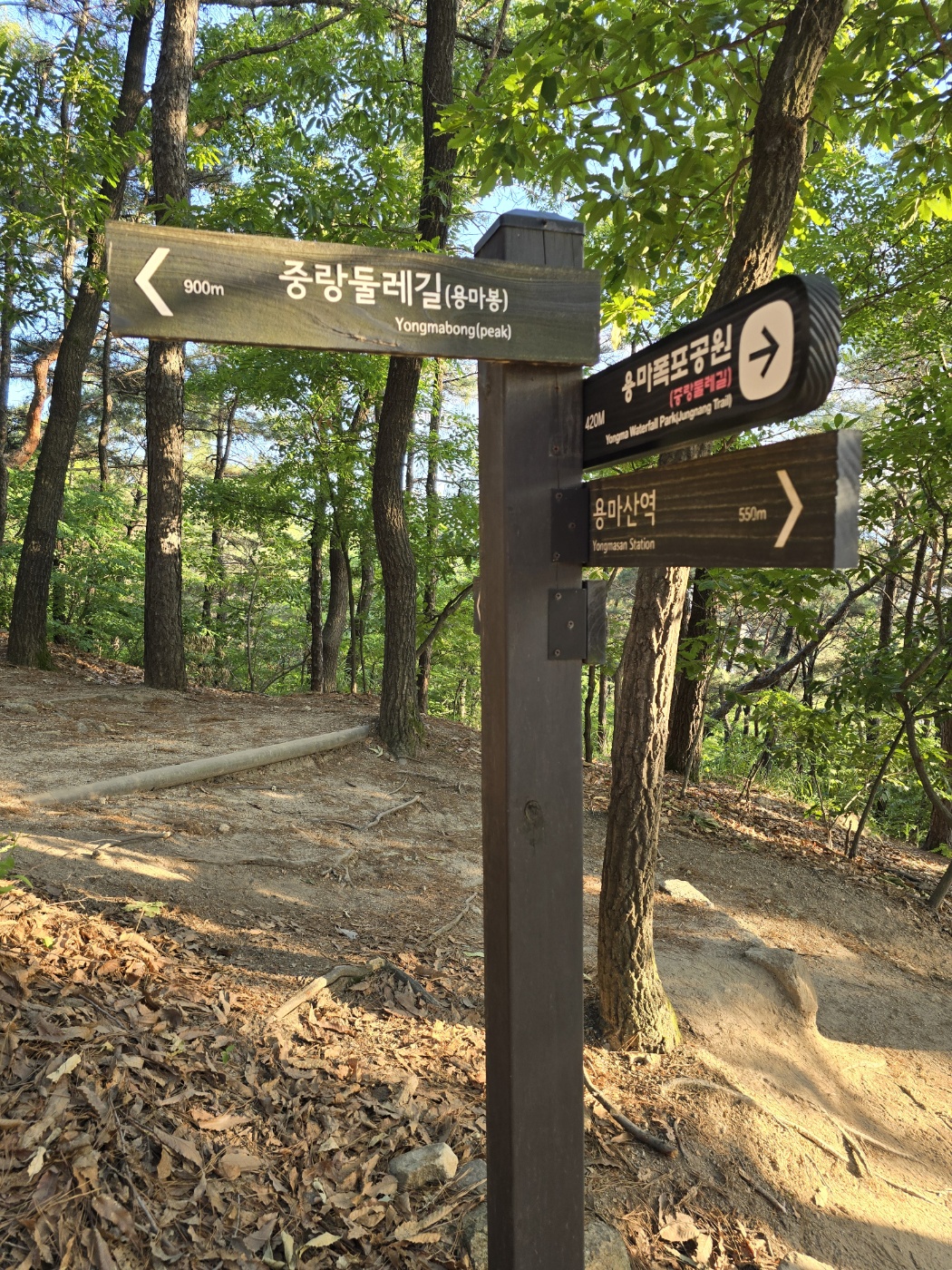 용마산 정상으로 가는 길목 곳곳에 이정표가 잘 안내되어 있어 어렵지 않게 용마산 정상(용마봉)에 도착했다. 올라가면서 주변 전경을 보고 싶어서 계속 뒤돌아보게 됐었다. 용마폭포공원에서 용마봉까지 30~40분 정도면 올라올 수 있는 거리였다. 그리 오랜 시간을 투자하지 않더라도 이런 멋진 경치를 감상할 수 있다는 게 행복했다. 아직은 해가 저물지 않아 용마봉 정상에서 잠시 쉬면서 주변 조망을 감상했다.