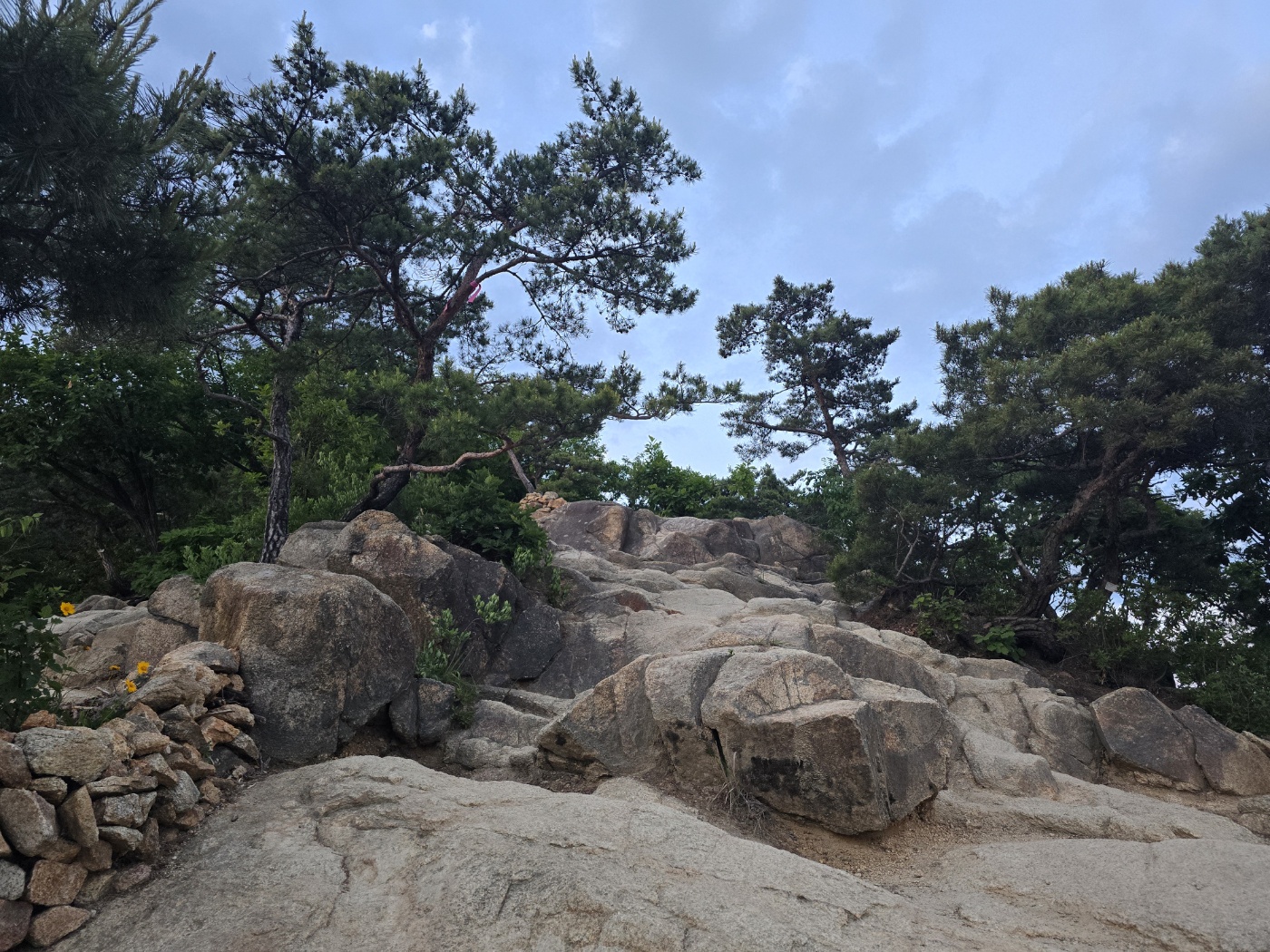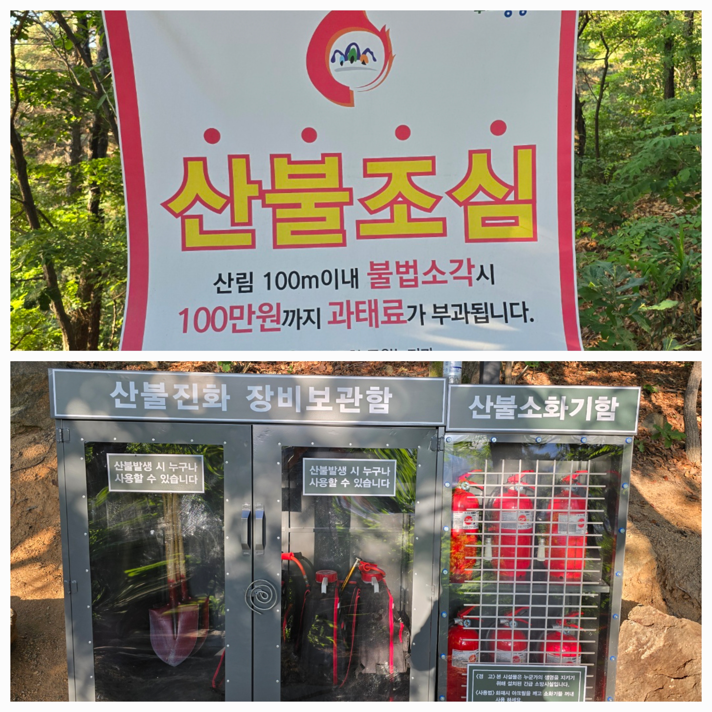 약간의 경사가 있는 돌과 흙으로 만들어진 길을 따라 올라갔다. 산불조심이라고 크게 쓰인 현수막을 본 지 얼마 지나지 않아 산불진화 장비보관함과 소화기함이 있는 곳에 다다랐다. 겉모습을 보니 설치된 지 얼마 되지 않은 새것처럼 보였다. 산불진화 장비를 사용할 일이 없기를 바라며 계속 올라갔다.