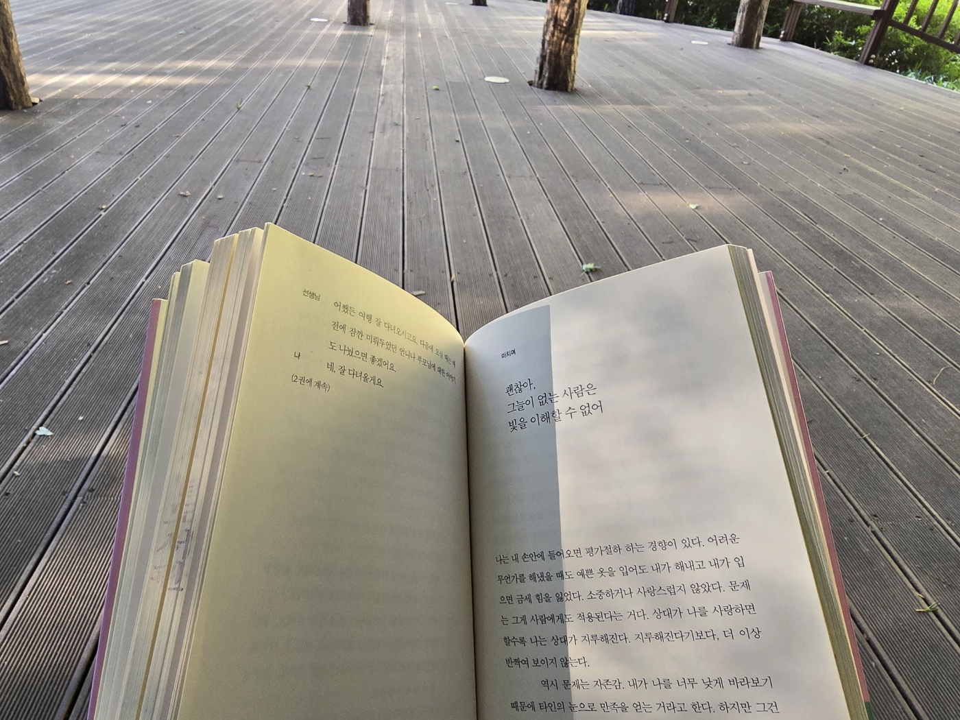 야간산행을 하러 왔는데 너무 일찍 와버렸다. 아직도 해는 쨍쨍하고 하늘은 파랗다. 이럴 때는 역시 독서만 한 게 없다. 나무그늘 아래 벤치에 자리를 잡아본다.